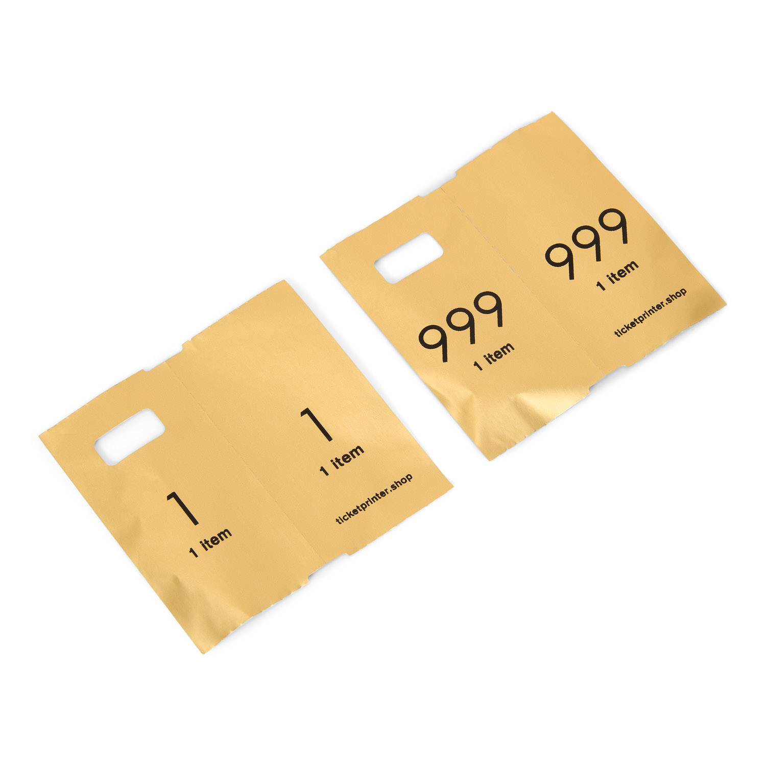 Pre-printed paper cloakroom tags, GOLD WITH BLACK PINT. Replace your plastic cloakroom tags by these high quality pre-printed cloakroom tickets. Value pack containing 1000 tickets. Easy solution for events. Use the numbered sequences to check your turnover. Need tickets more frequently? Have a look at our CoatCheck Ticketprinter, a great solution to print your own tickets - up to 50% cheaper than pre-printed tags.